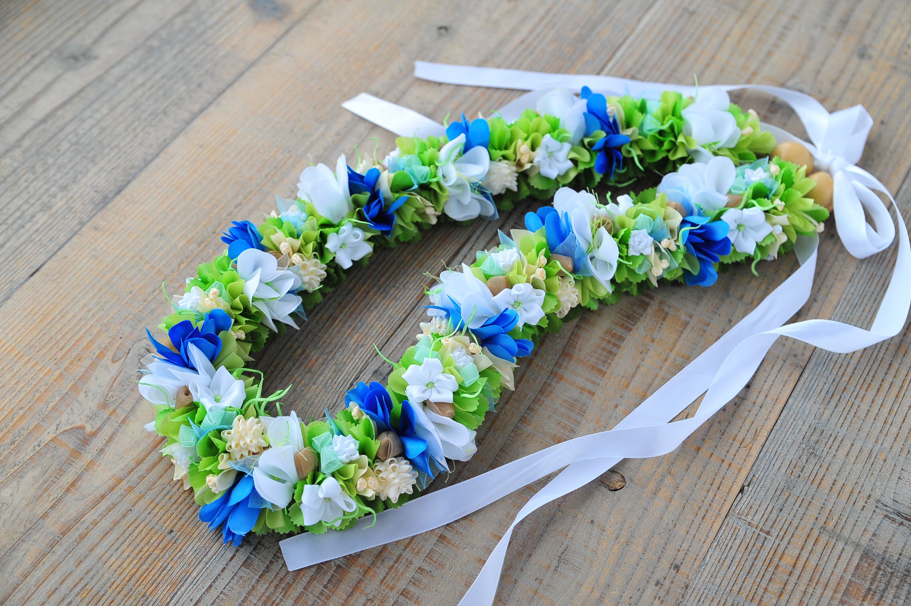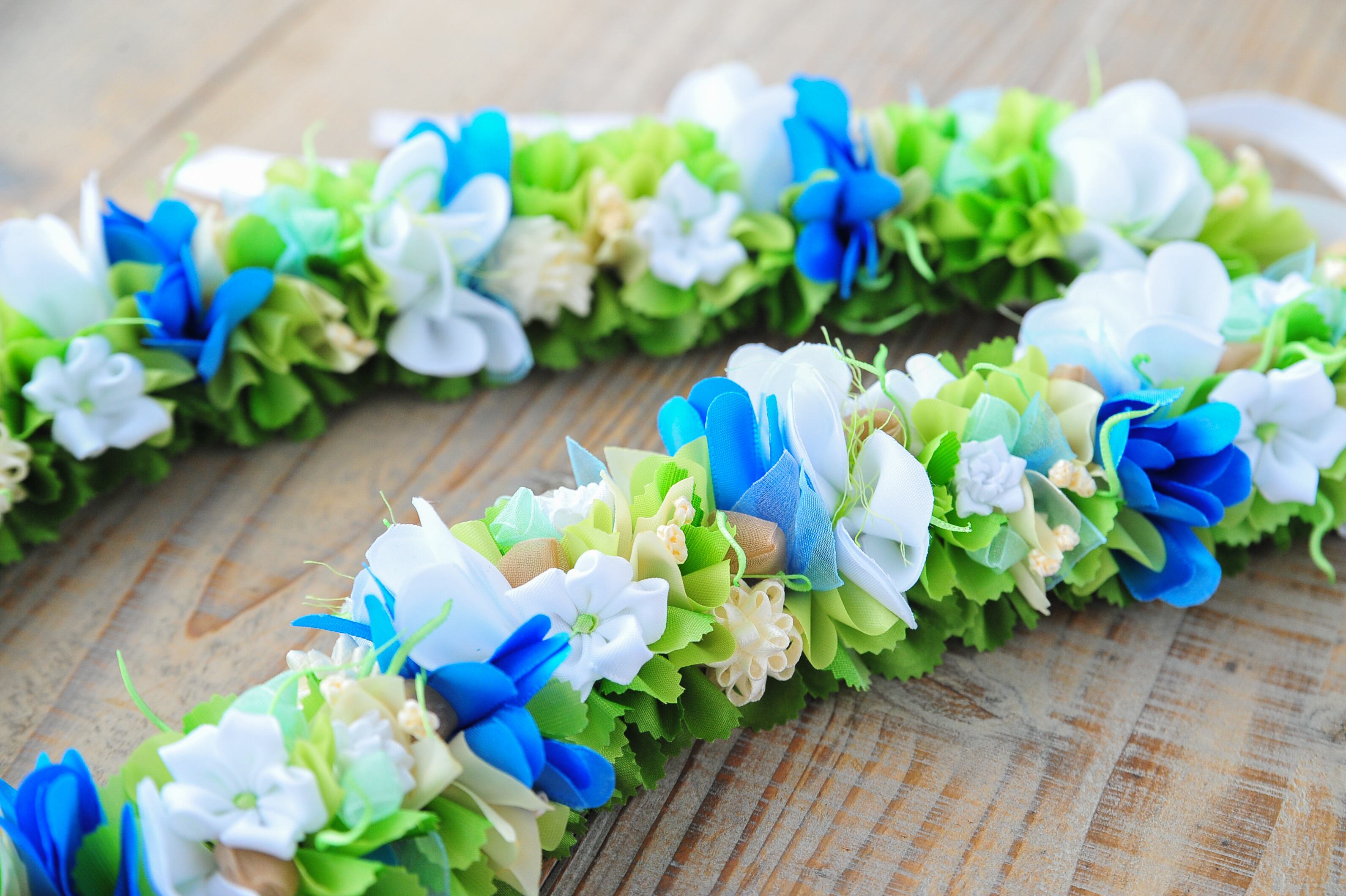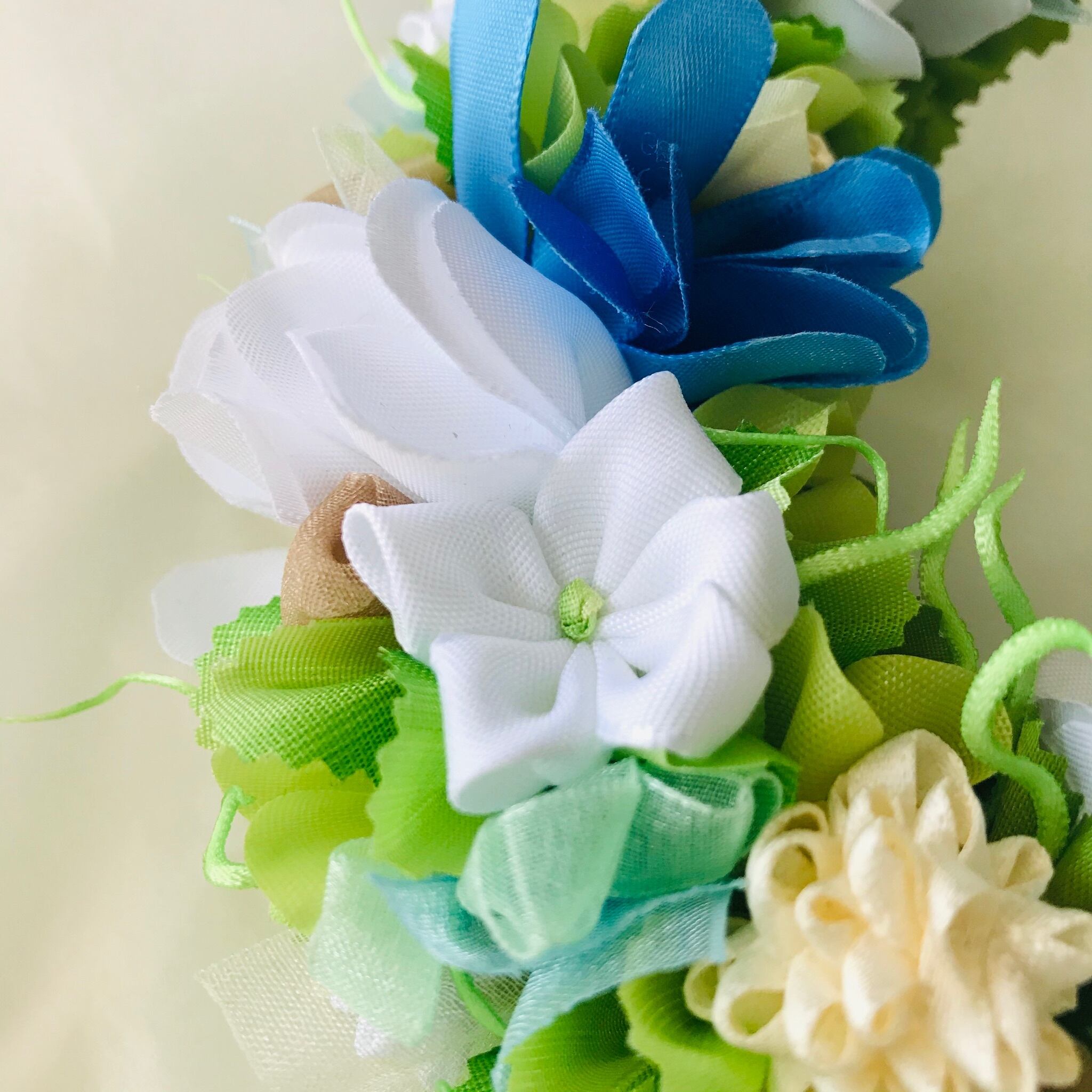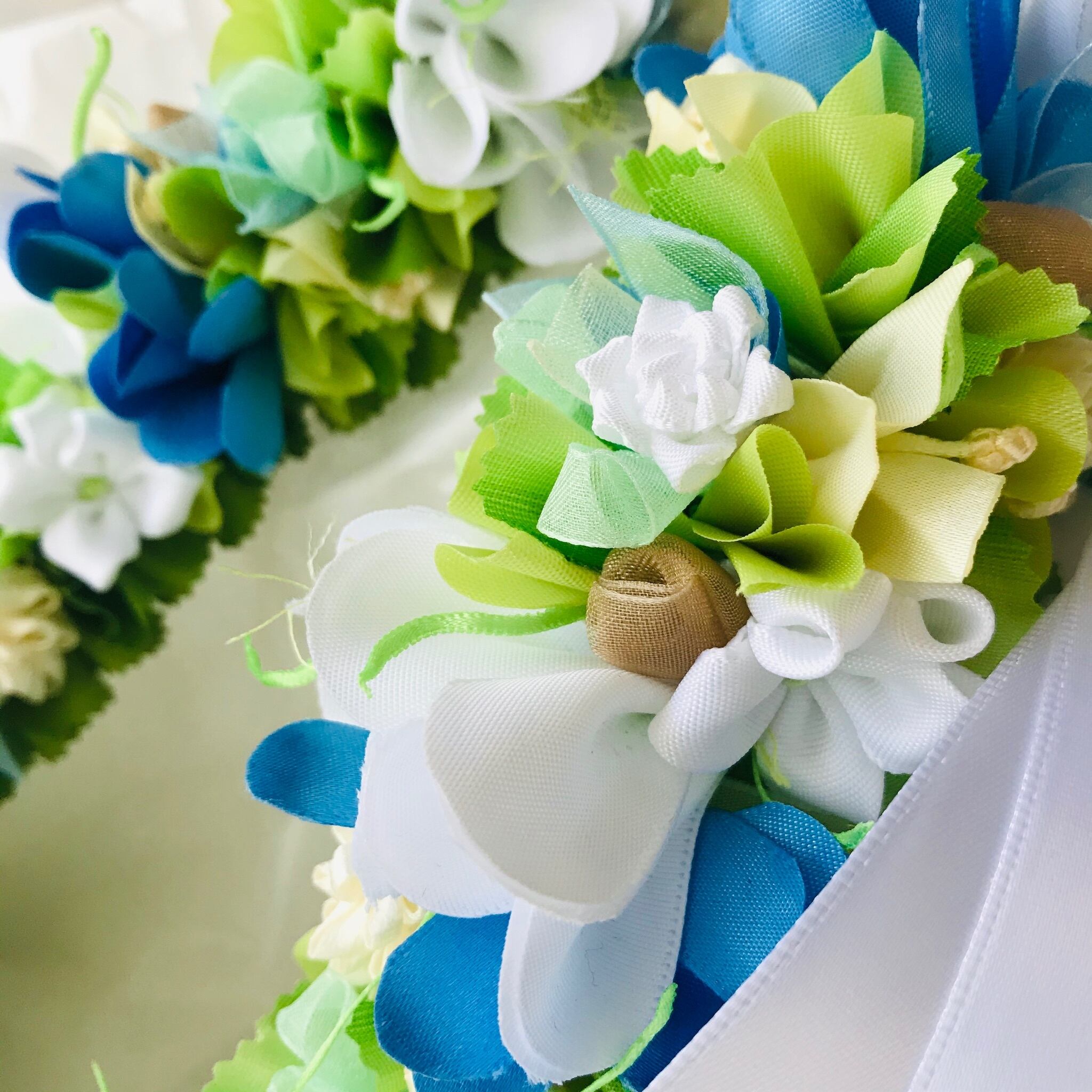 ハワイに咲く花 ステファノーチス・ピカケ・マム・木の実・水滴などをリボンで表現し、香りのよい花を集めてレイにしました.:*