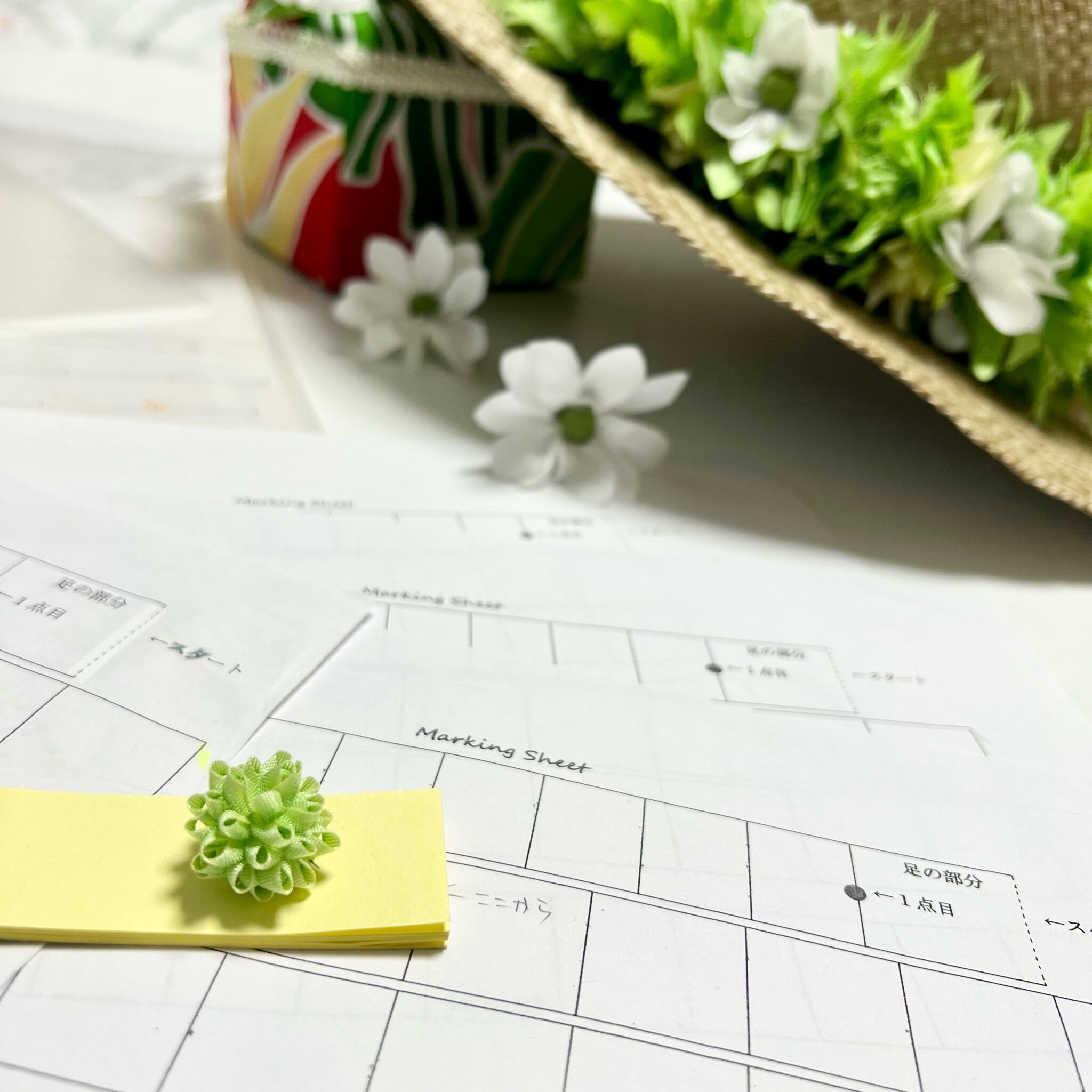 自然を感じる爽やかなグリーンを贅沢に使用したマムのレイのワークショップです。